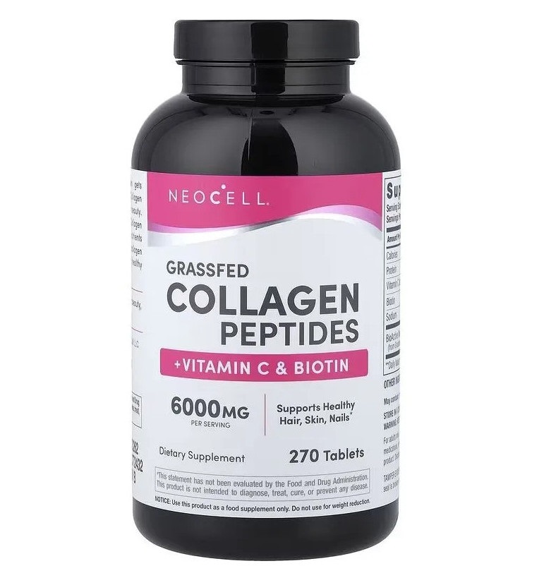 Пищевая добавка Grassfed Collagen Peptides + Vitamin C & Biotin от Neocell создана для здоровья вашей кожи, волос, ногтей и суставов. Она помогает питать кожу, делая ее мягкой, гладкой и здоровой, замедляет старение.