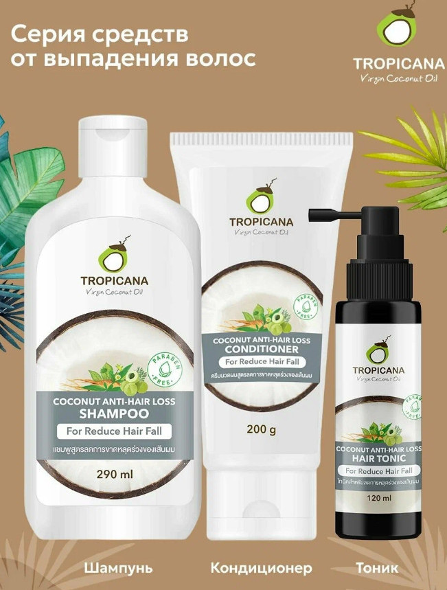 Кондиционер Tropicana Coconut Anti-Hair Los борется с алопецией, устраняет обильное выпадение волос, появление перхоти. Устраняет зуд и воспаления, нормализует обмен веществ в коже головы. Комплексный уход за кожей головы и волосами Tropicana - oil 2 в 1 на основе кокосового масла. Защищает от воздействия агрессивных окрашиваний и укладок, сохраняя цвет и блеск. Увлажняющее и восстанавливающее действие кондиционера Tropicana проникает в каждый волос и корень, питая изнутри и стимулируя рост.